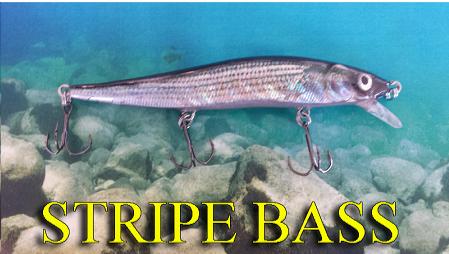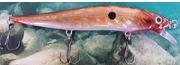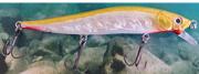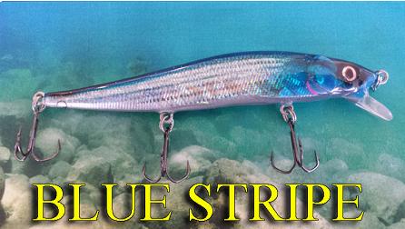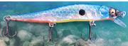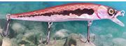 This is a slow sinking jerkbait, about a foot a second depending on line size & type They come equiped with the proper out-barb, "sticky sharp" treble hooks designed to increase hook-sets, stainless hardware & oval line tie. Holographic undercoat produces huge flashes. 1/2 oz - 4 1/2 in |